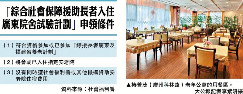 照片:Chunxuanmao日期(广州开林路)高级公寓。 \ ta如果PAO记者Li Ziyan [Ta Kung Pao News]记者Zheng Wendi报告说:政府在广东医院为较老的家庭提供了由护理基金资助的实验计划的“全面的社会保障援助”,该计划持续了三年,旨在为老年人提供资金,“每位合格的人都可以获得每一个月的资金,并获得了5,000美元的资金 - 汇集了5,000美元的杂志 - 总计1,000名,有一个1,000个杂志。计划;除了在CSSA老年人计划下获得现金援助外,还没有获得社会福利机构或其他机构的支持。程序。从现在开始,CSA的合格成年人可以申请服务机构或社会保障办公室负责其CSAS案件。该机构将提供有关指定家庭护理院的信息服务,该服务允许老年人及其家人选择适当的家庭护理院,并帮助他们完成申请方法。审查完成后,社会保障局将向申请人发出通知,以告知申请结果并修复资金分配。公共住房成人可以维持公共住房6个月。服务机构将创建一组经验,以参观指定家庭护理院的个人,使成年人可以参观设施和体验服务,以选择合适的家庭护理院。第一组经验定于今年11月举行。 SWD将向老年人协助的合格中央情报局发送信件,以识别飞行员计划,并邀请他们参加P在经验的经验中表达。社会保障部门的一位发言人补充说,住房委员会已于今年3月实施了更灵活的维修工作,为老年人提供了更长的改编,以便老年人选择退休到大陆。参加试点计划的年长公共住房居民可以将目前的公共住房单位或家庭注册维护6个月,从离开香港到大陆退休。这些安排也适用于住房协会的老年居民。