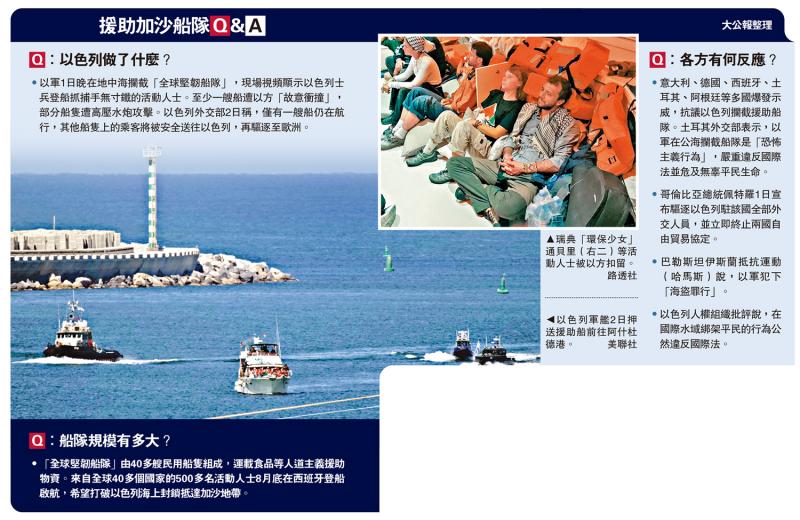 上图:瑞典“女性环境”隧道(右第二)和其他激进主义者仅限于以色列。 \ reuters; Larawan sa Ibaba:Ang Mga Barkong Pandigma ng以色列Ay Nag -escort ng tulong na barko sa sa ashdod port sa ika -2。 \ AP问:以色列做了什么? •以色列军队在1日晚上阻止了地中海的“全球艰难军械库”。现场视频显示以色列士兵登船以俘虏没有武装的激进分子。至少有一艘船被以色列的身边“意外碰撞”,有些船只遭到高压水炮的袭击。以色列外交部在第22号外交部说,只有一艘船航行,另一艘船上的乘客被安全运送到以色列,然后被驱逐到欧洲。问:舰队有多大? •“全球艰难的车队”由40多艘平民船只组成,这些船只驱动着有助于食物等材料。来自世界各地40多个国家的500多名激进分子登上了西班牙的一艘船8月底,预计将打破以色列海上封锁并到达加沙地带。问:各方如何反应? •示威活动在意大利,德国,西班牙,图尔基耶,阿根廷和其他国家爆炸,以抗议以色列在救助方面绑架以色列。图尔基耶外交部说,与高海军武器互动的以色列军队是一种“恐怖主义行为”,严重违反了国际法,危害了无辜平民的生命。 •哥伦比亚总统佩特罗(Petro)在1日宣布,他将释放该国所有以色列外交官,并立即结束两国之间的自由贸易协定。 •以色列军队犯下了“海盗罪”,巴勒斯坦伊斯兰抵抗运动(HAMAS)。 •以色列人权组织指出,与国际法相比,在国际水域中绑架平民。如果pao的汇编
