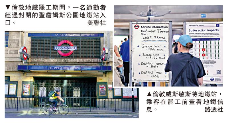 左:通勤者在伦敦地下罢工期间经过了圣詹姆斯公园封闭的地铁站的入口。 \ ap;右:伦敦威斯敏斯特地铁站,乘客在罢工前检查地铁信息。 \ REUTERS [TA KUNG PAO新闻]全面的英国广播公司和美联社:英国伦敦地下员工将从7日起罢工5天,要求提高薪水和短期工作时间。整个罢工始于8次,这导致了伦敦的严重交通影响,数以百万计的通勤者和游客被阻止旅行,这预计在英国经济中会造成2.3亿磅(约24亿美元的香港)损失。在7日进行较小的罢工之后,伦敦地下系统通常停止从8到-11。只有“伊丽莎白线”和“伦敦地上铁路”仍在运转,但是车厢非常紧,延误了。 8日,星期一,伦敦中部的交通是我n混乱,由于地铁的吸力,总线乘客流量大大增加,导致大量人在公交车站前排队。购买或需要大幅提高价格,并预订自行车。工作时间。薪水为3.4%。代表地铁工人的“铁路,海事和工会”将坚持要将每周工作时间从35小时减少到32小时。工会指出,自2018年以来,地铁系统的员工人数已减少了2,000,并且员工经历了长期的疲劳和不合理的安排。伦敦运输公司表示,当局无法负担与支持其工作时间有关的费用。目前,双方都没有谈判谈判,工会向伦敦市长萨迪克问。可汗干预。伦敦的地下系统有272个车站和11条路线,占领了城市和周围的郊区,阳光充足的乘客量高达500万。经济中心C和商业研究估计,这次罢工在经济中的经济中可能耗资2.3亿英镑。受罢工的影响,需要重新安排伦敦的两个Coldplay乐队。